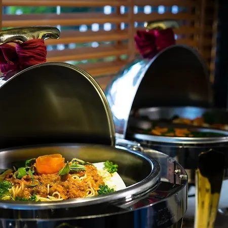 Guests can unwind in a warm setting of Ruby Rooftop restaurant serving local cuisine.