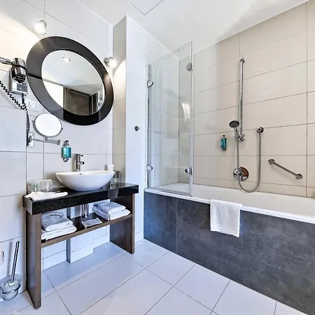 The Sopot hotel features 31 rooms equipped with a flat-screen TV with satellite channels as well as a mini-fridge-bar, coffee and tea making facilities. Furnished with a big desk and a couch set, these rooms have a patio and a balcony. The spacious bathrooms come with bathrobes and slippers. The property offers views of the courtyard from these rooms.