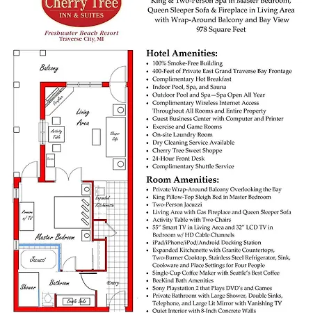 The Cherry Tree Inn & Suites Traverse City provides guests with baby chairs and cribs for their children. The presence of a golf center ensures guests an active stay at the Traverse City property. The Cherry Tree Inn & Suites also features laptop-compatible safes and complimentary wireless internet access for those arriving on business.