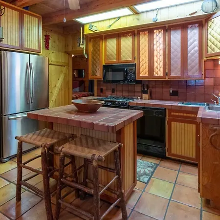 A microwave oven, coffee and tea making equipment, and a kitchenware are also included in the kitchen at Creekside Bunkhouse villa.
