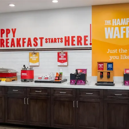The Hampton Inn By Hilton Turlock breakfast features bacon, oatmeal, and waffles. The Turlock hotel invites guests to have a drink at a snack bar.