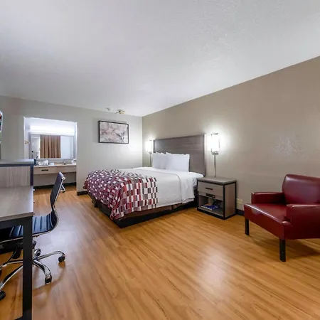 Ironing facilities, along with tea and coffee-making facilities, provide in-room convenience at the Hampton Inn. Some of the renovated rooms of this Charlottesville hotel include red furniture.