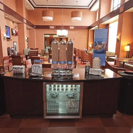The Hampton Inn & Suites features 130 rooms with coffee/tea making facilities, and such comforts as ironing facilities and air conditioning. They are furnished with queen size beds or king-size beds along with a couch bed and a study desk.
