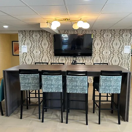 The hotel offers breakfast with meat, eggs, and waffles. You may walk 6 minutes to Applebee's or eat by Little Caesars Pizza, located 0.2 miles away.