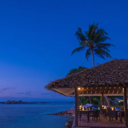 The à la carte restaurant in the Le Nautique Waterfront Hotel La Digue offers dishes for dinner. The restaurant serves European cuisine. Guests can relax at the on-site lounge bar. The bar area includes a terrace. The neighborhood features restaurants, including Tarosa Bar and Restaurant, which is just 950 feet from the La Digue property.