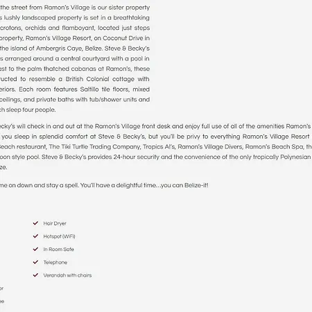 Offering cars for rent, as well as Wi-Fi throughout the property, the 4-star Ramon'S Village Resort San Pedro is around 20 minutes' walk from Bigsup Belize. Located 2.1 miles from Belizean Melody Art Gallery, this San Pedro hotel features 71 rooms with views of the courtyard.