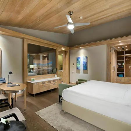 Some of the 512 sound-proofed rooms at the modern Regnum Carya are furnished with a couch set, and appointed with coffee and tea making equipment. The rooms have sound-proofed windows as well as marble flooring. Bathrooms come with a spa bathtub, a separate toilet, and a shower, along with a hairdryer and bath sheets. Rooms are overlooking the patio.