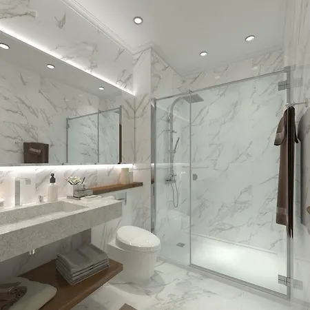 The accommodation offers rooms with a balcony and a dressing area featuring air conditioning, along with a flat-screen TV with satellite channels. Some rooms are decorated in luxurious design. Bathroom amenities include a bathtub and a separate toilet, along with comforts such as a hair dryer and bathrobes. The rooms overlook the pool.