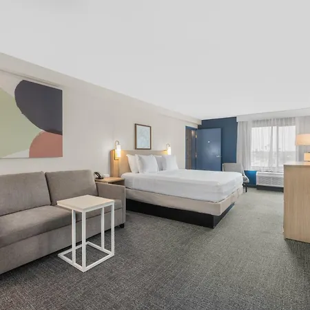 There are 93 rooms at this Bakersfield hotel, each of them has an iron with ironing board and an air conditioner, as well as entertainment amenities such as WiFi. They are furnished with couch beds along with a couch bed and a writing table.
