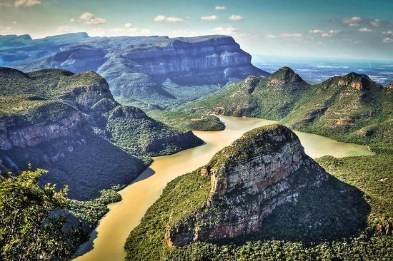 Blyde River Canyon Nature Reserve is a regional park in South Africa known for its stunning views. Visitors can enjoy a lookout point that offers a panoramic view of a beautiful forested valley, perfect for photography.