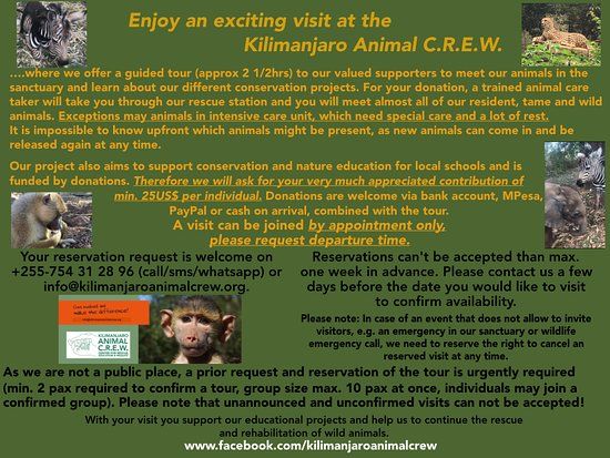 Kilimanjaro Animal C.R.E.W is an animal rescue and education center. Visitors can tour and meet various rescued animals, including both tame and wild species while learning about their care.