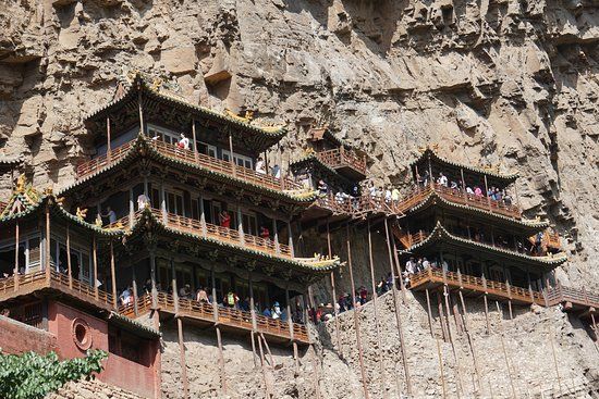 Hengshan Hanging Temple is an ancient monastery built on the cliffs of Mt. Hengshan, which is one of China's five sacred mountains. Its unique design features cave halls connected by winding corridors and bridges, making it a fascinating site to explore.