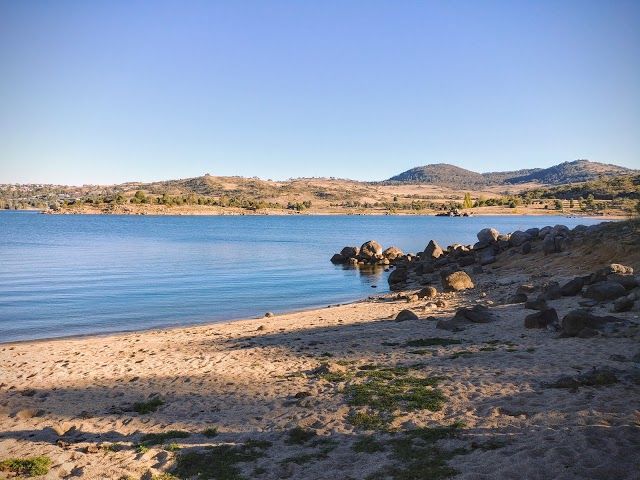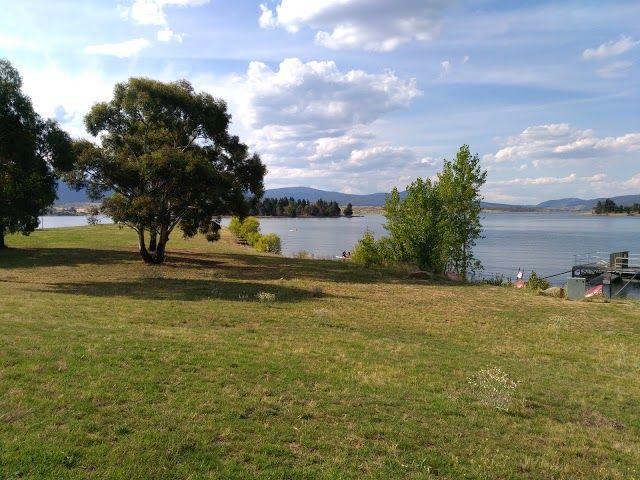 Foreshore Park is a serene park located by the lake in Jindabyne, Australia. It features a small beach for swimming, walking paths, and beautiful views of the surrounding mountains.