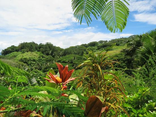 Flora Tropica Botanical Gardens in Savusavu, Fiji, features 300 palm species and diverse tropical flowers, offering picturesque views over Savusavu Bay.