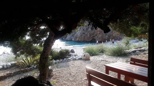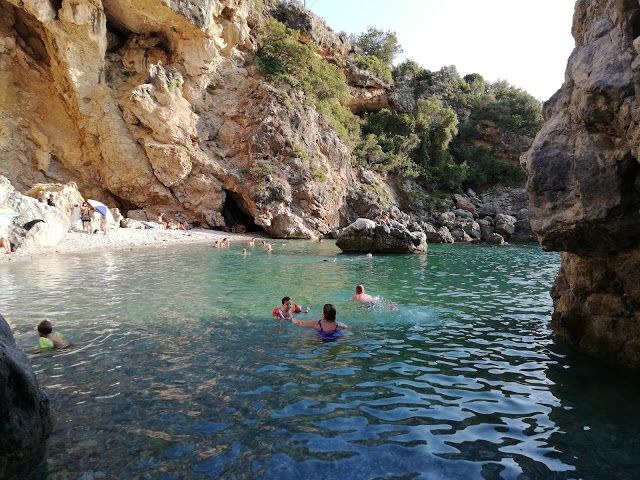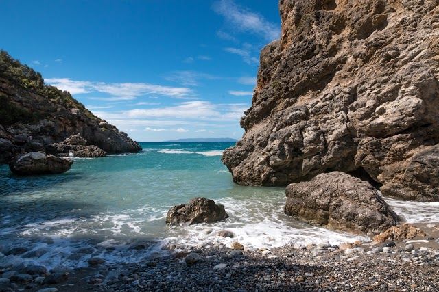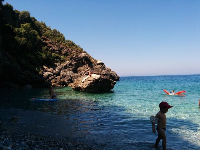 Foneas Beach is a beautiful public beach in Stoupa, Greece. It features clear waters for swimming and great spots for snorkeling, along with stunning canyon views.