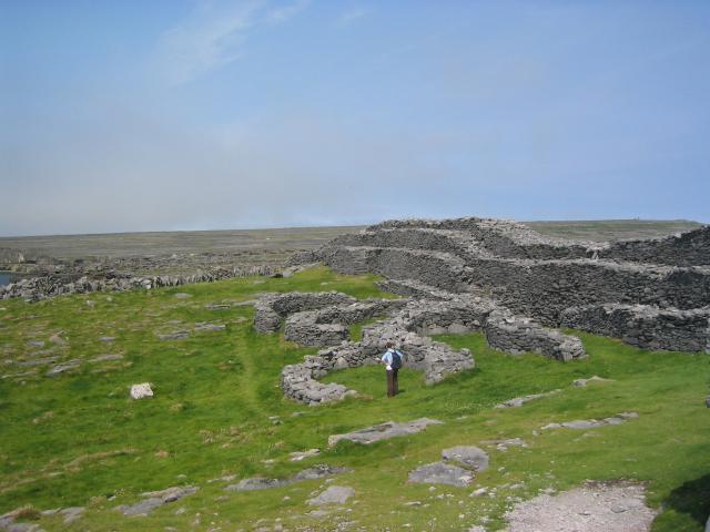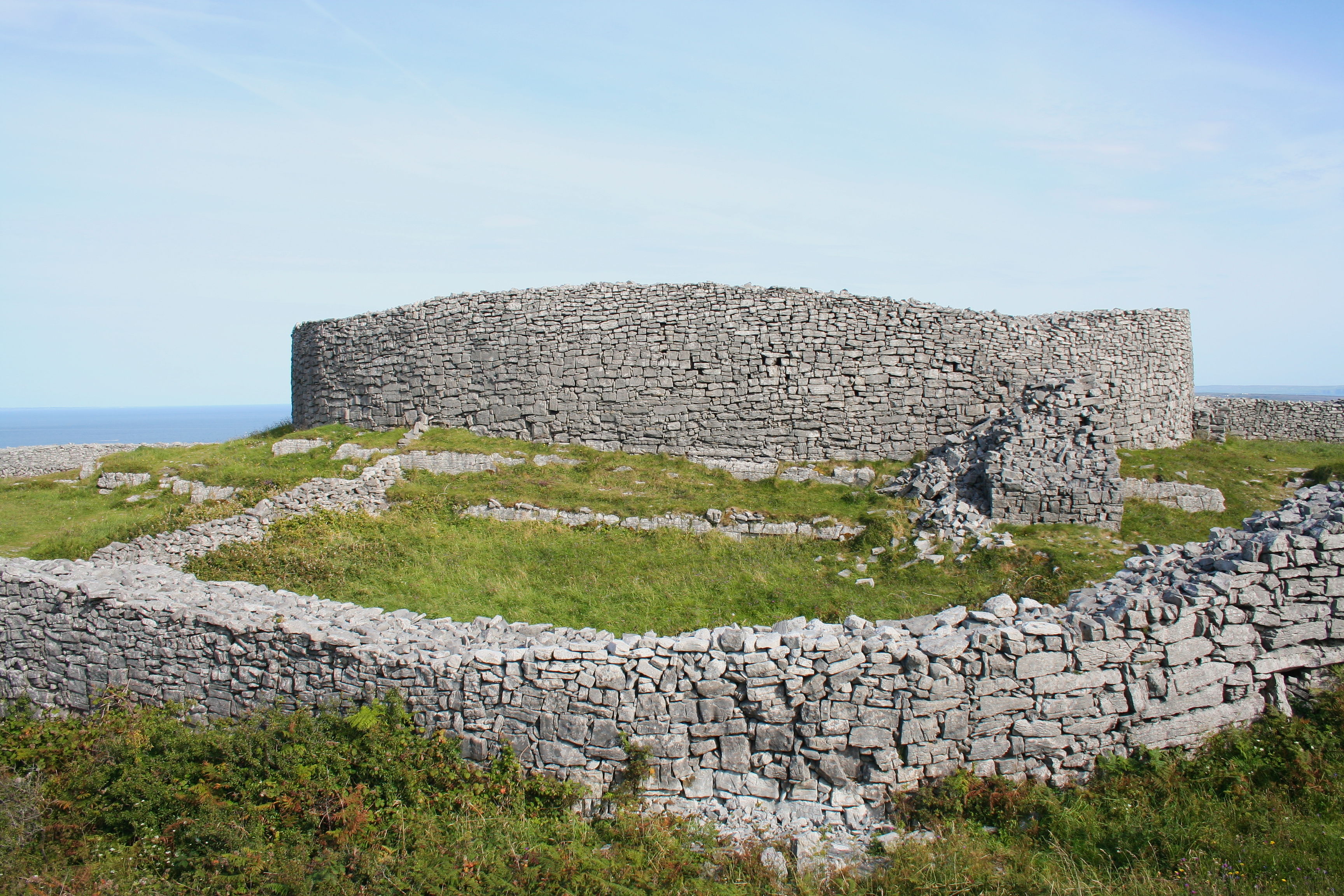 Dun Duchathair is an ancient fortress on a cliff in Inis Mor. It features tall terraced walls made of dark limestone and dates back to the Iron Age.