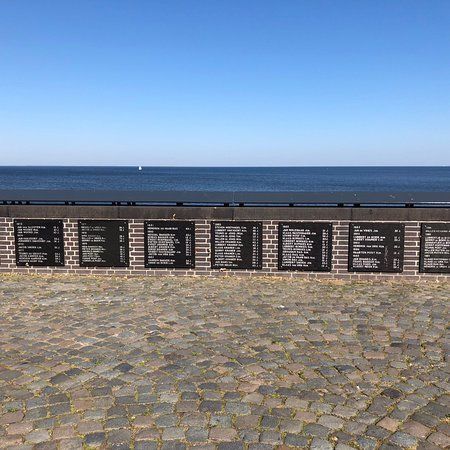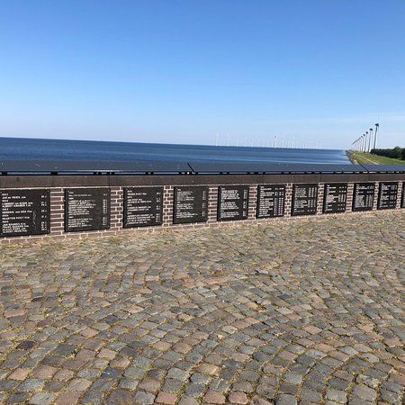 The Vissersmonument is a statue of a woman in a flowing dress, looking out to sea. It honors the seafarers of Urk who lost their lives at sea, with marble tablets around it listing their names and details.