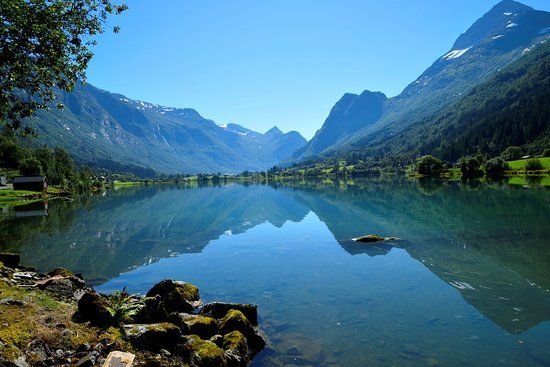 Oldevatnet is a stunning lake surrounded by tall mountains. It is known for its clear blue water and proximity to a beautiful glacier, making it a great spot for camping and enjoying nature.