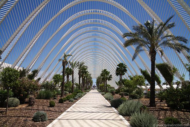 L'Umbracle, an open-air gallery, offers visitors an exceptional experience beneath its modern arches.